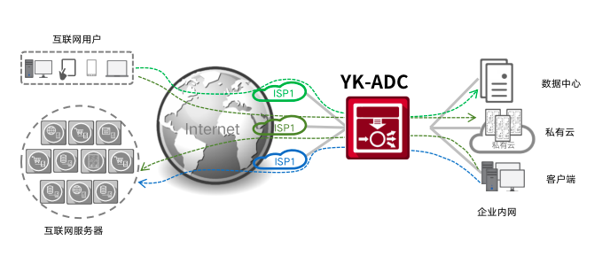 云科通明湖应用交付控制器给予链路负载均衡技术(LLB)和全局负载均衡技术(GSLB)分别实现出向流量(Outbound)和入向流量(Inbound)的统一管理。